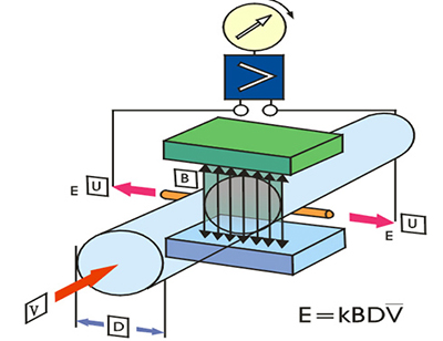 式中 k, d 為常數(shù),由于勵磁電流是恒流的,故 B 也是常數(shù),則由 E= KBdv 可知,體積流量 Q 與信號電壓 E-成正比,即流速感應(yīng)的信號電壓 E 與體積 Q 成線性關(guān)系。因此,只要測量出 E 就可確定流量 Q,這是