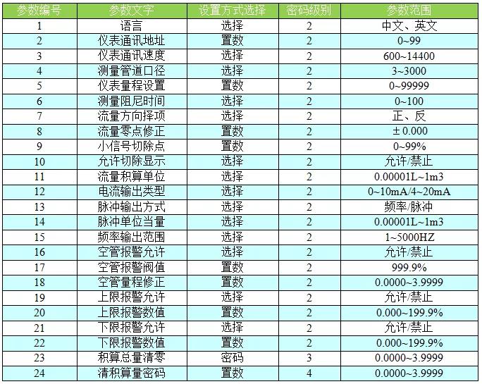 轉(zhuǎn)換器工友 24 個參數(shù),使用儀表時,用戶應(yīng)根據(jù)具體情況設(shè)置各參數(shù)。轉(zhuǎn)換參數(shù)一覽表如下: