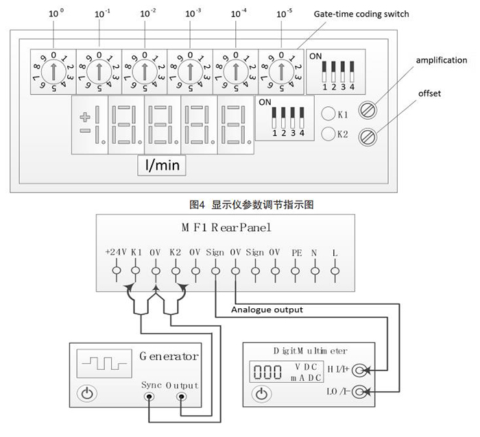 流量計(jì)的輸出信號(hào)為兩路相位差90°的脈沖信號(hào)。選擇符合要求的標(biāo)準(zhǔn)源模擬流量計(jì)輸出信號(hào)。要求脈沖幅值5V左右,頻率范圍:0~2000Hz,頻率準(zhǔn)確度優(yōu)于1×10-5。以信號(hào)發(fā)生器模擬流量計(jì)輸出脈沖信號(hào),接線方法見圖5。信號(hào)發(fā)生器的兩路輸出信號(hào)分別連接流量計(jì)的K1和K2輸入端,流量計(jì)模擬輸出端連接數(shù)字多用表進(jìn)行電壓或電流測(cè)量。在流量計(jì)無信號(hào)輸入時(shí),調(diào)整圖4中“offset”電位器,使數(shù)字多用表測(cè)量值為零。然后輸入頻率使流量計(jì)顯示滿量程流量值,調(diào)整圖4中“amplification”電位器,使數(shù)字多用表測(cè)量值為滿量程流量對(duì)應(yīng)的標(biāo)稱電壓或電流值。