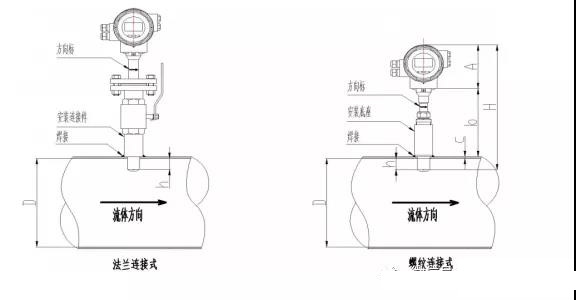 (2)螺紋連接型插入式電磁流量計因其安裝原理,在安裝過程中需手動調節尺寸 b(表頭底部至管道外壁距離),以保證插入深度(h)為管道內徑(D)的1/10。尺寸 b 計算公式:b(表頭底部至管道外壁距離)=H(產品總長)-A(表頭高度)-h(插入深度)-c(管道壁厚)