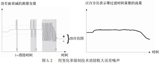 “變化率限制值”與“不敏感時間值”是用來消除某些增加阻尼不能除去的噪聲。它能夠從真實的流量信號中判別出階躍信號引起的噪聲和漿液尖狀噪聲。這種判別是以變化率的限制和持續時間為依據的。圖 5.2 所示為使用變化率限制技術去除粗大誤差的原理說明。該功能為在前面采樣中獲得的流量數據經一階濾波后的,設定某一上限和下限(變化率)。如果當前采樣的流量數據超過或低于這個極限值,而且在超過或低于這個極限值的變化時間之內,則認為這種變化是由于噪聲所引起的,CPU 予以切除;而當超過或低于這個極限值的變化在設置的不敏感時間以外,則認為這種變化是由于真正的流量變化所引起,CPU 就認可是測量流量的變化。